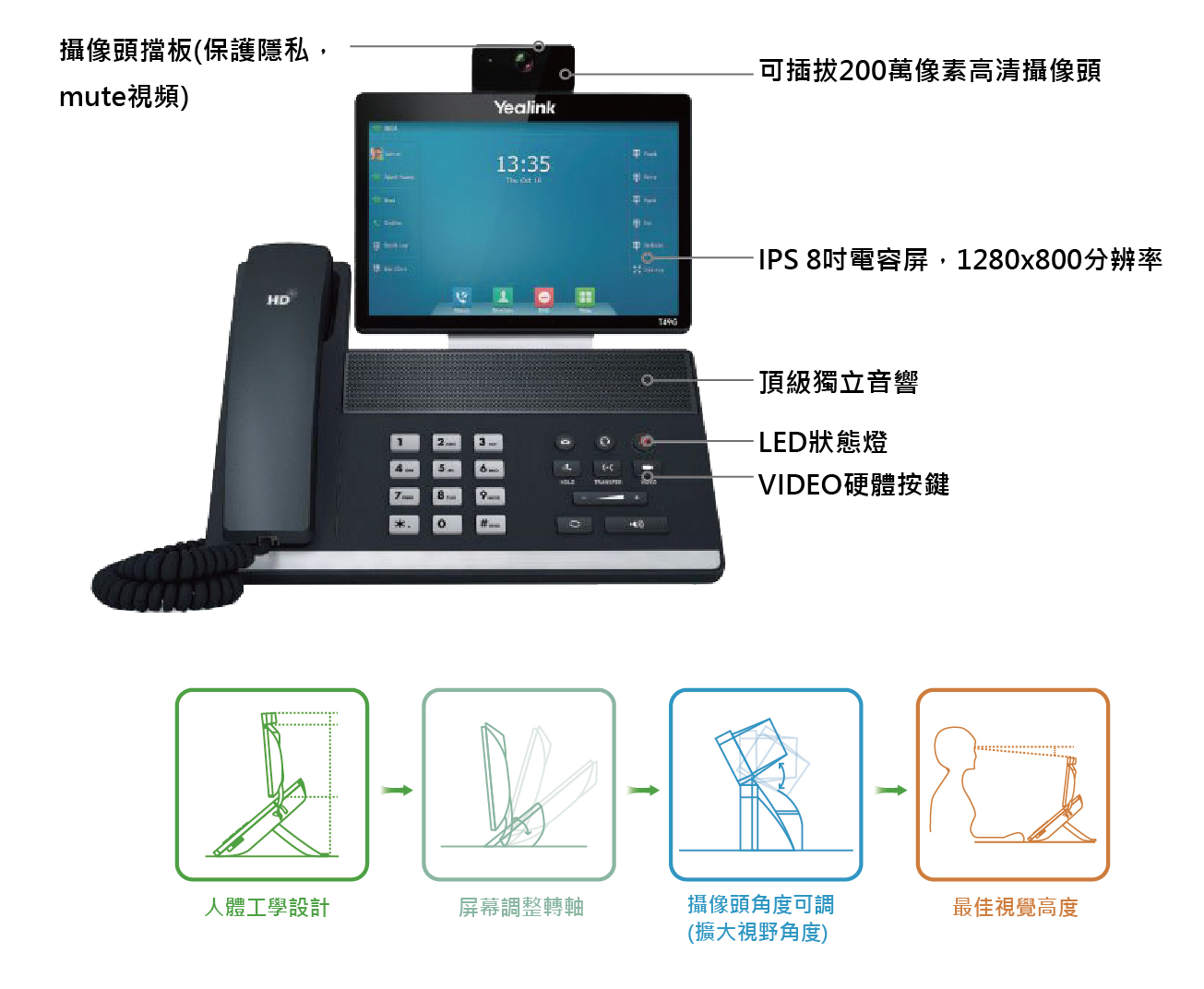 - 8 feature keys: message, headset, mute, hold, transfer, video, redial, speakerphone